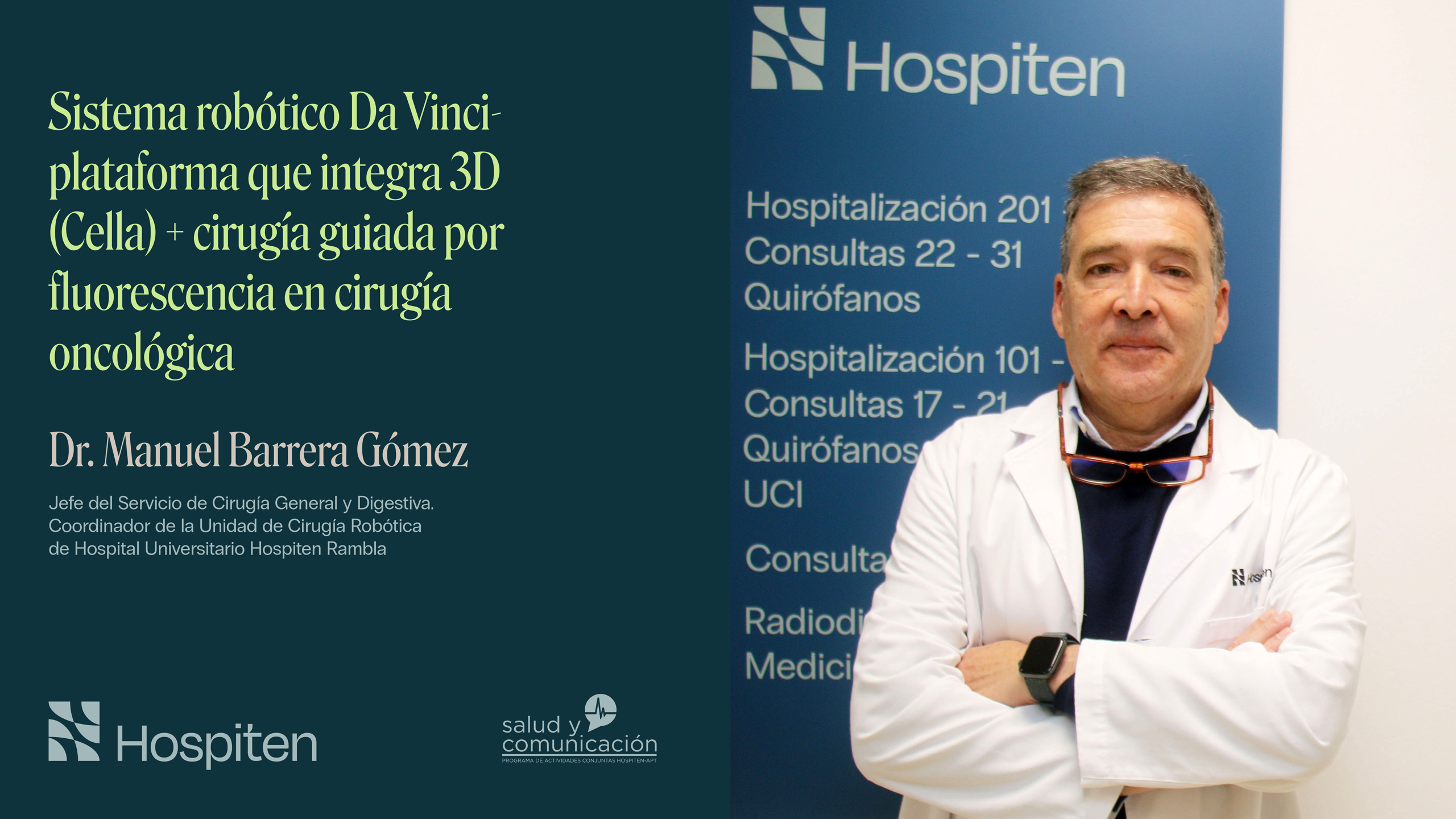 Salud y Comunicación | Nuevo pódcast de ‘Salud y Comunicación’. El Doctor Manuel Barrera Gómez nos habla en esta ocasión sobre el Sistema robótico Da Vinci, plataforma que integra 3D (Cella) y cirugía guiada por fluorescencia en cirugía oncológica. El jefe del Servicio de Cirugía General y del Aparato Digestivo de Hospital Universitario Hospiten Rambla, … Leer más